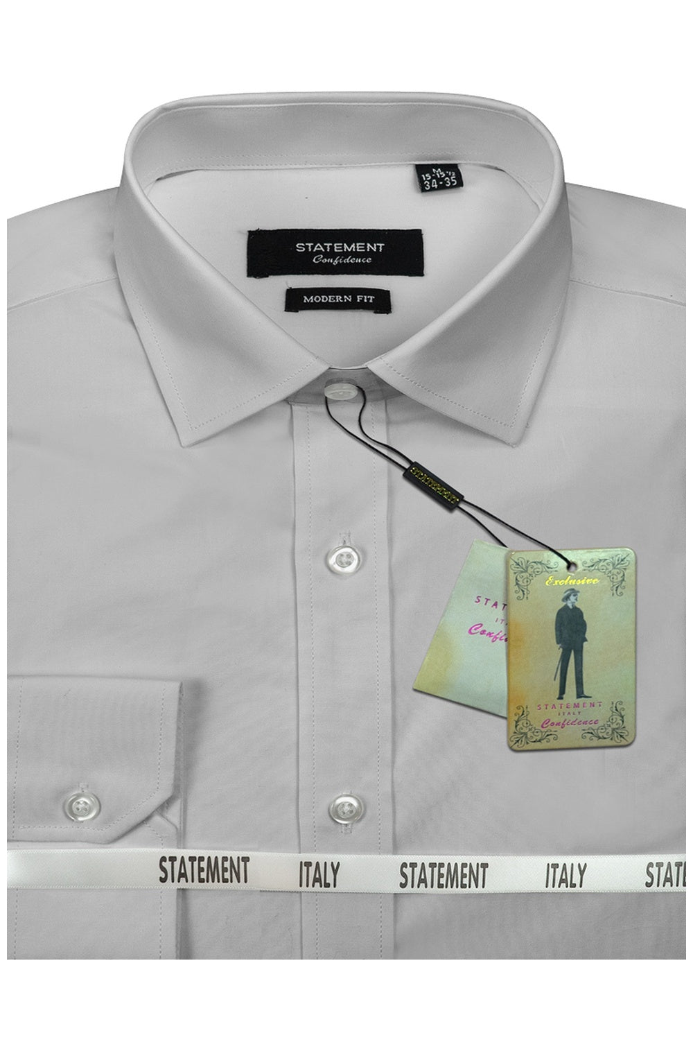 The "Aurora" Grey Laydown Dress Shirt, crafted from premium 100% cotton that is both lightweight and comfortable. The laydown collar is an updated spread design that pairs perfectly with either a bow tie or necktie. The modern fit size scale appeals to most gentleman of all shapes and sizes.